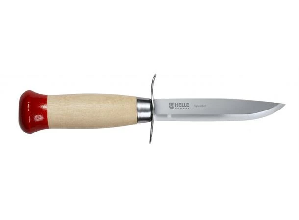 Barnekniv.Skaft av bjørk med fingerstopper.Lengde 95mm. Blad av Sandvik 12C27 rustfritt 1-lagsstål. Lengde 90mm. Slire av ekte lær.