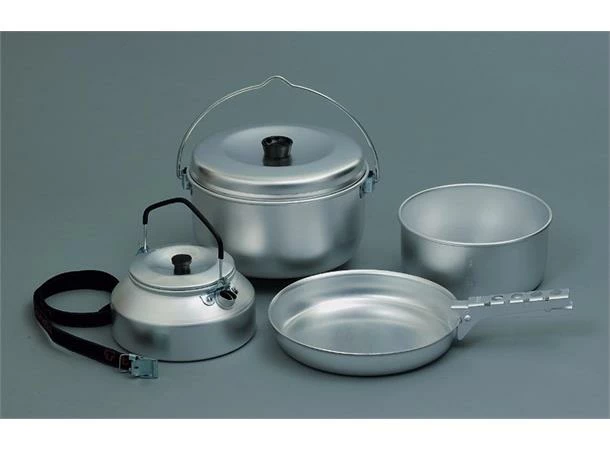 Kjele 2,5 liter med håndtak, kjele 1,5 liter, stekepanne Ø200 mm, kaffekjele 1 liter, lokk som passer stekepannen och kjele 2,5 liter, tang, alt i aluminium, og rem 720 mm.